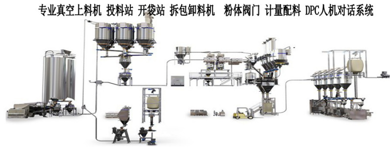 本公司提供的粉體配料系統(tǒng)是運用粉體輸送儲、存設(shè)備和各種計量傳感器,對一種或多種粉體物料按量輸送、配比混合及輸送投料的設(shè)備系統(tǒng)。是在精細化工、化學(xué)、油漆、油脂、藥品、飼料、日用化工、食品、制藥等行業(yè)生產(chǎn)過程中常用集成設(shè)備,通常是由DCS控制相關(guān)設(shè)備模塊,如:拆包站、輸送管路、儲存艙、計量倉等組成的自動化配料設(shè)備系統(tǒng)。例如:反應(yīng)釜的粉體投料控制、滑石粉、樹脂、飼料等粉體成品包裝配比。